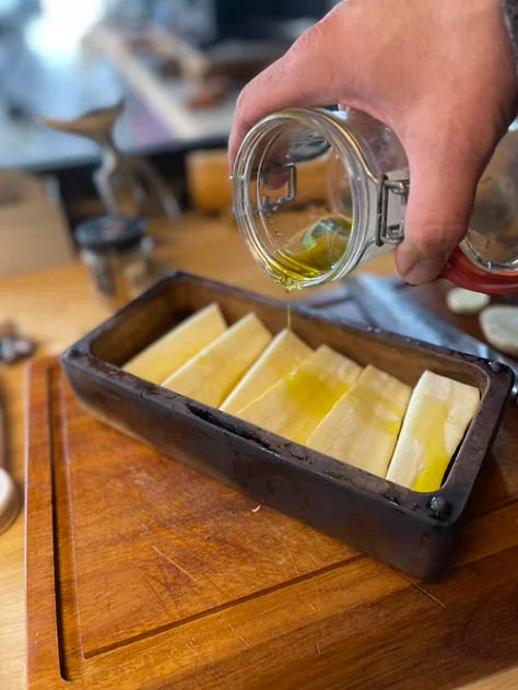 Ajout du Chocolat et du Beurre : Cassez le chocolat en petits morceaux et répartissez-les sur les poires. Ajoutez également une noix de beurre sur chaque demi-poire.