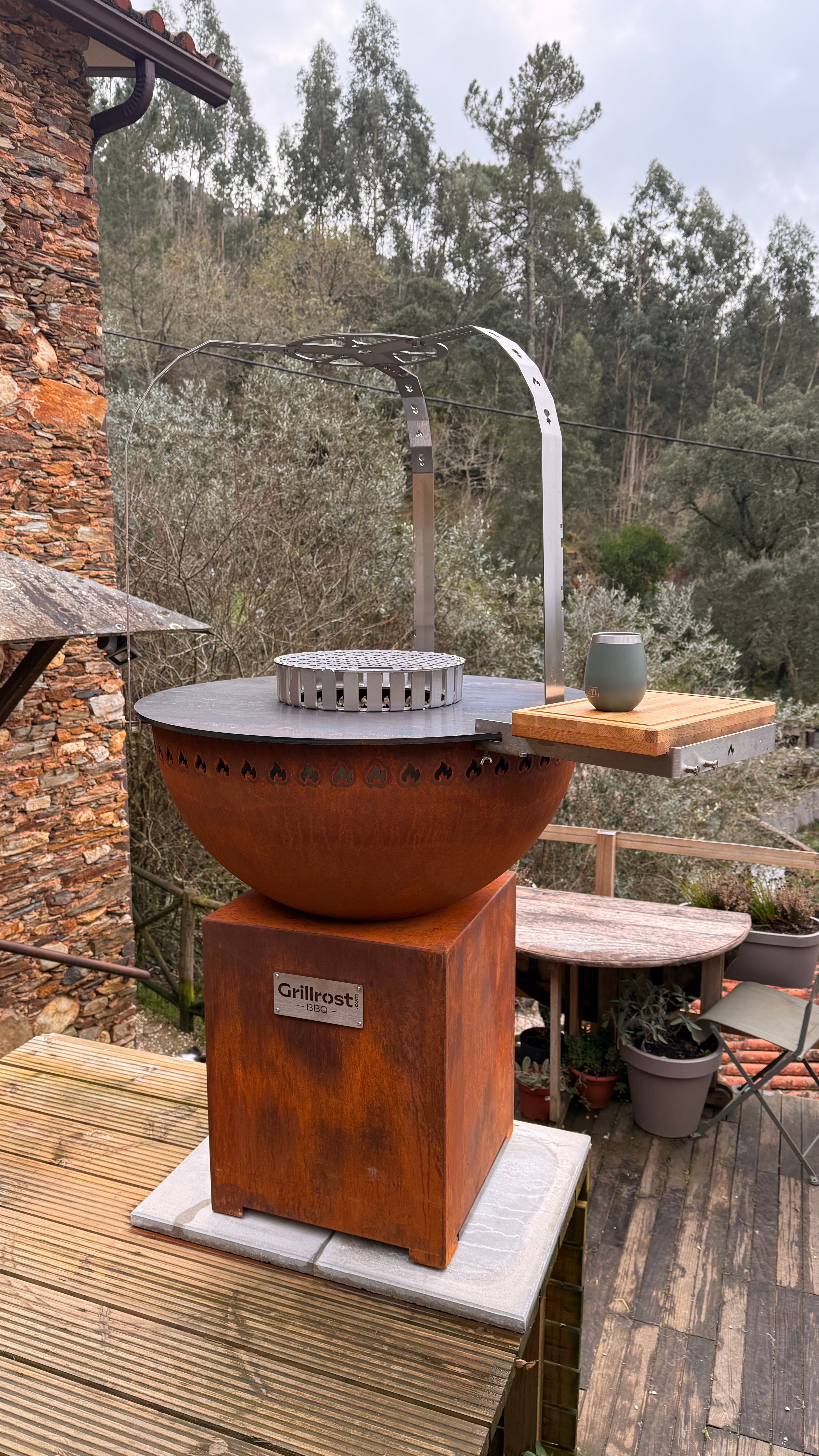 Ce qui distingue réellement ce brasero, ce n’est pas un point isolé. C’est la cohérence globale. Chaque détail a une raison d’être. On n’est pas face à un objet décoratif auquel on a ajouté une plaque. On est face à un véritable appareil de cuisson outdoor, pensé pour le feu, la braise, la plaque, la fonte.