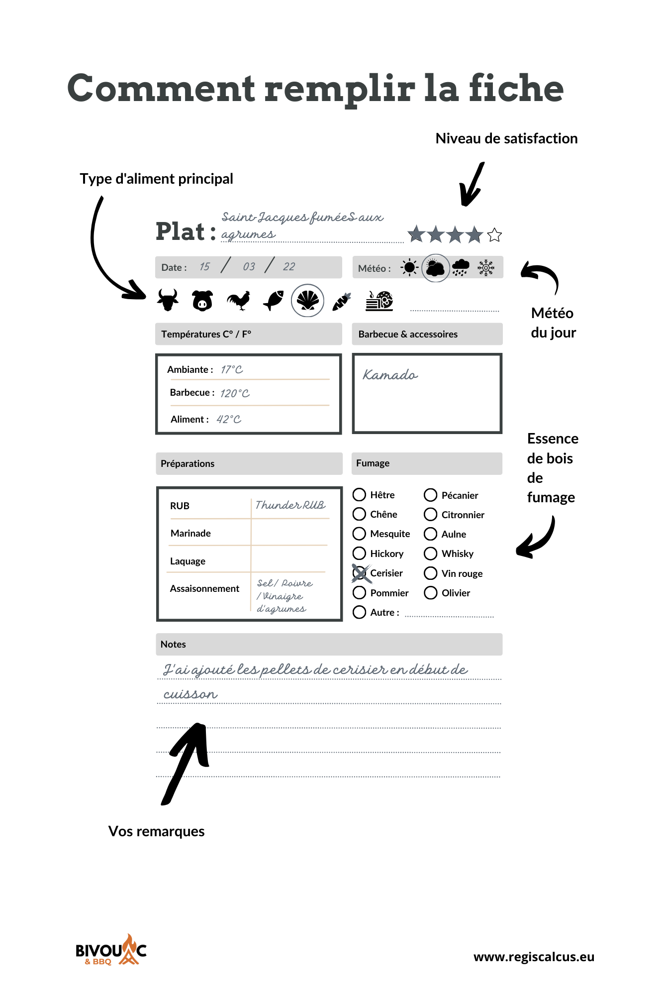 On y consigne le contexte (météo, vent, humidité), le matériel utilisé, le type de combustible, les réglages d’air, les températures clés, les interventions en cours de cuisson, et surtout le résultat final avec un regard critique : texture, équilibre, fumée, et ce que tu changerais.